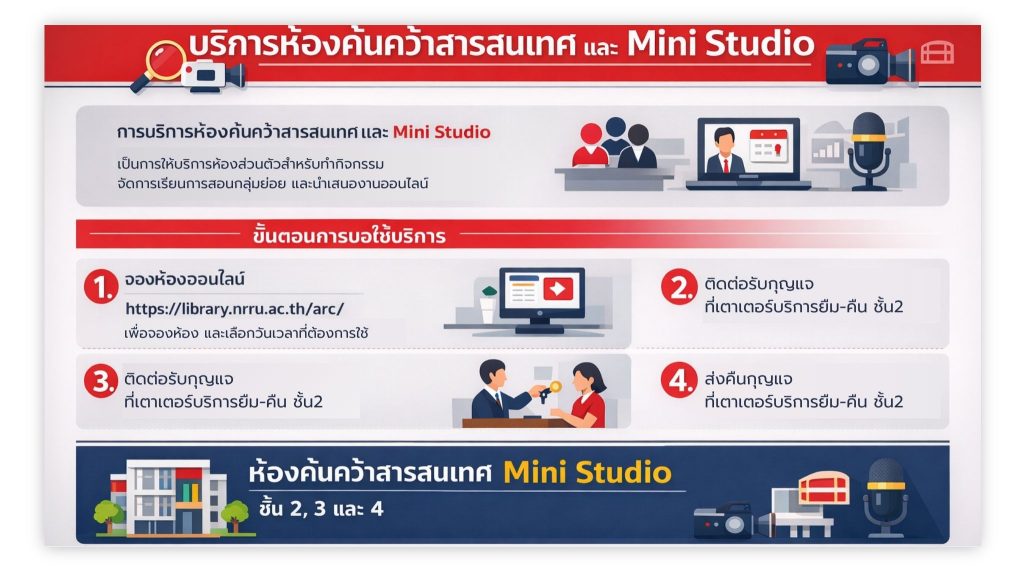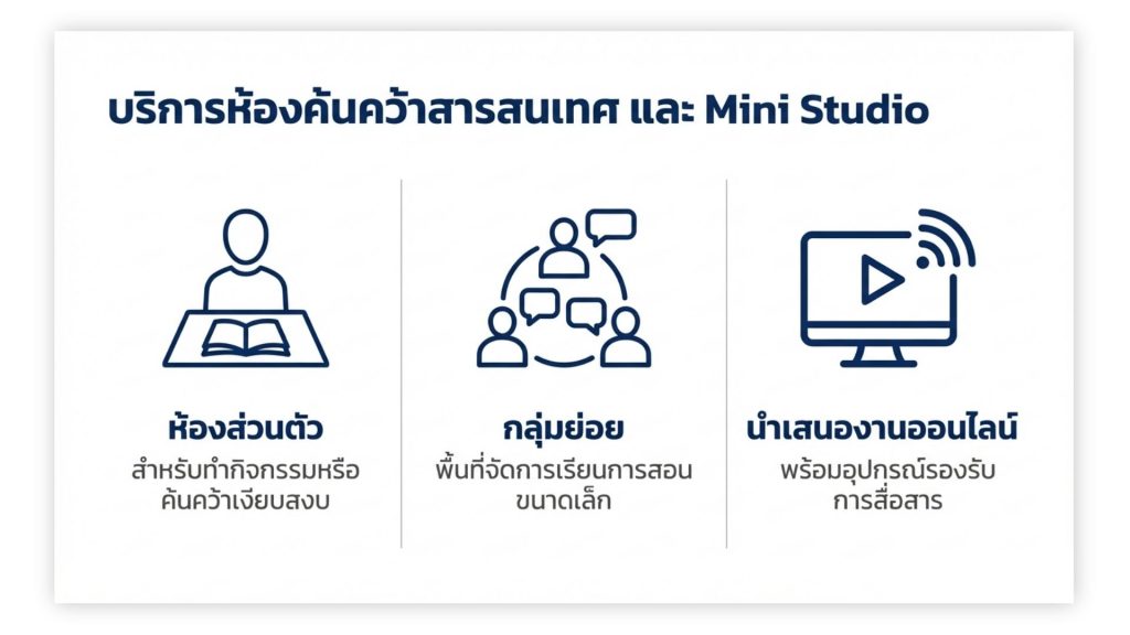 การบริการห้องค้นคว้าสารสนเทศและMini Studio เป็นการให้บริการห้องส่วนตัวสำหรับทำกิจกรรมหรือจัดการเรียนการสอนกลุ่มย่อย และนำเสนองานออนไลน์