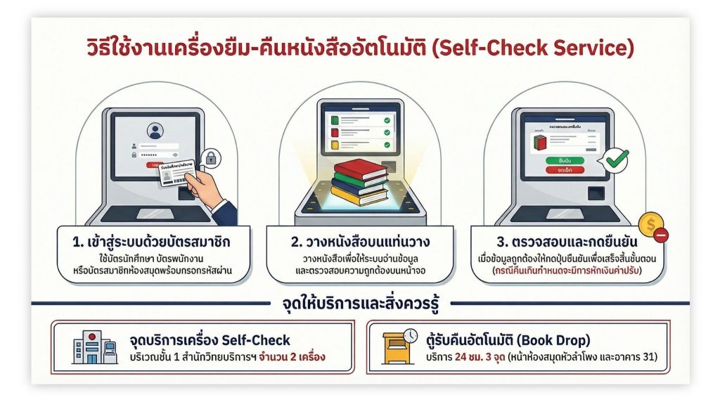 เครื่องยืม-คืนด้วยตนเอง หรือ Self-Check โดยแบ่งเป็นการยืมและการคืนด้วยตนเองตามเมนูของระบบผู้ใช้บริการต้องใช้บัตรสมาชิก ได้แก่ บัตรนักศึกษา/บัตรพนักงาน/บัตรสมาชิกห้องสมุดทุกครั้งในการใช้บริการ