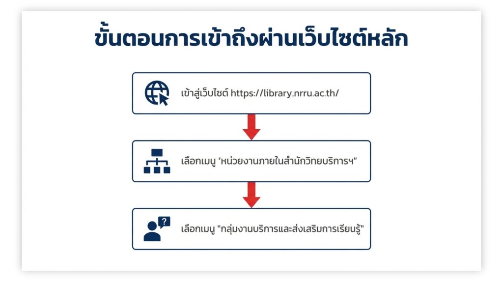 เว็บไซต์สำนักวิทยบริการและเทคโนโลยีสารสนเทศ URL : https://library.nrru.ac.th/ เข้าเมนูหน่วยงานภายในสำนักวิทยบริการฯ และเลือกเมนู กลุ่มงานบริการและส่งเสริมการเรียนรู้ หรือ https://sites.google.com/nrru.ac.th/libraryservice/home