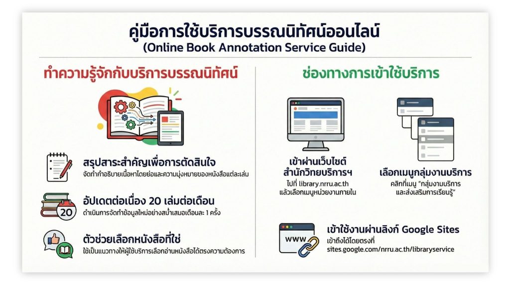 การบริการบรรณนิทัศน์ (Book annotation service) ผู้ใช้สามารถขอใช้บริการได้ที่ เว็บไซต์สำนักวิทยบริการและเทคโนโลยีสารสนเทศ URL : https://library.nrru.ac.th/ เข้าเมนูหน่วยงานภายในสำนักวิทยบริการฯ และเลือกเมนู กลุ่มงานบริการและส่งเสริมการเรียนรู้ หรือ https://sites.google.com/nrru.ac.th/libraryservice/home