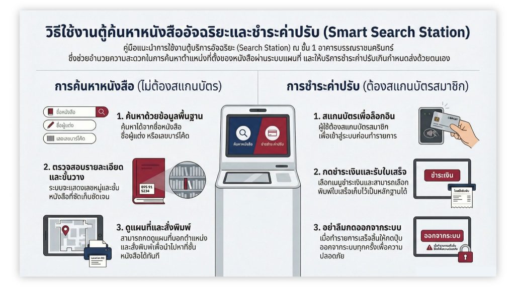 เป็นเครื่องช่วยอำนวยความสะดวกในการค้นหาหนังสือ และสามารถพิมพ์แผนที่บอกตำแหน่งของหนังสือเพื่อความรวดเร็วต่อการค้นหาหนังสือ รวมถึงการชำระค่าปรับเกินกำหนดส่ง