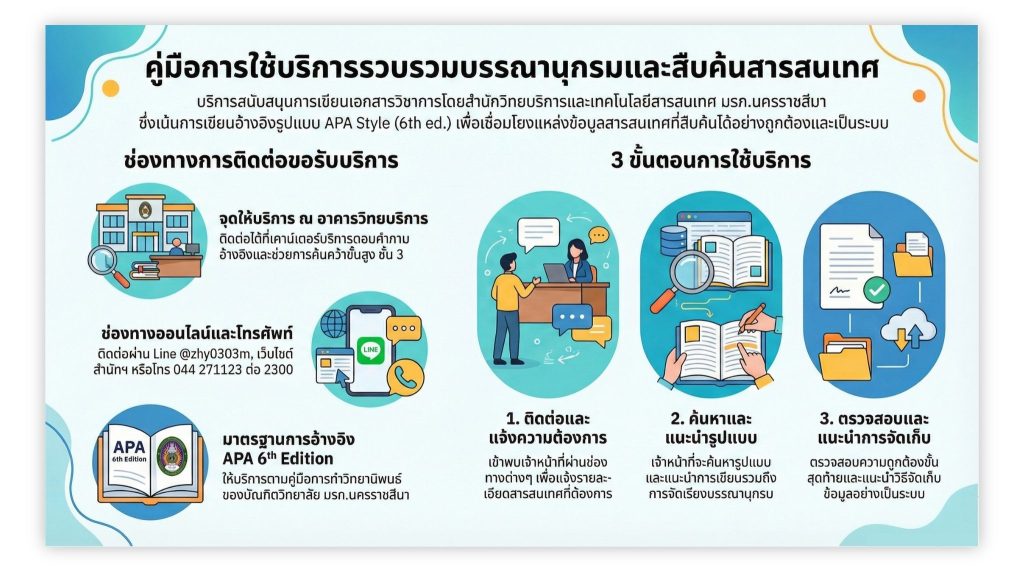 สำนักวิทยบริการและเทคโนโลยีสารสนเทศ มหาวิทยาลัยราชภัฏนครราชสีมาได้กำหนดให้เขียนการอ้างอิงตามคู่มือการทำวิทยานิพนธ์และภาคนิพนธ์ ของบัณฑิตวิทยาลัย เป็นการเขียนอ้างอิงแทรกในเนื้อหาแบบ APA Style (6th ed.)