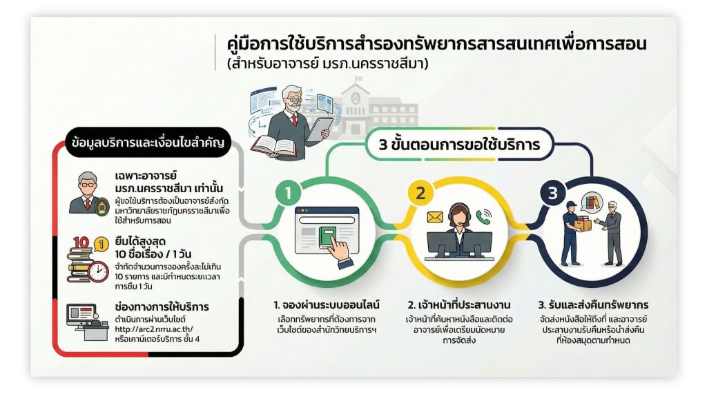 ผู้ขอใช้บริการจะต้องเป็นอาจารย์ของมหาวิทยาลัยราชภัฏนครราชสีมา เท่านั้น โดยมีขั้นตอนการขอใช้บริการ ดังนี้